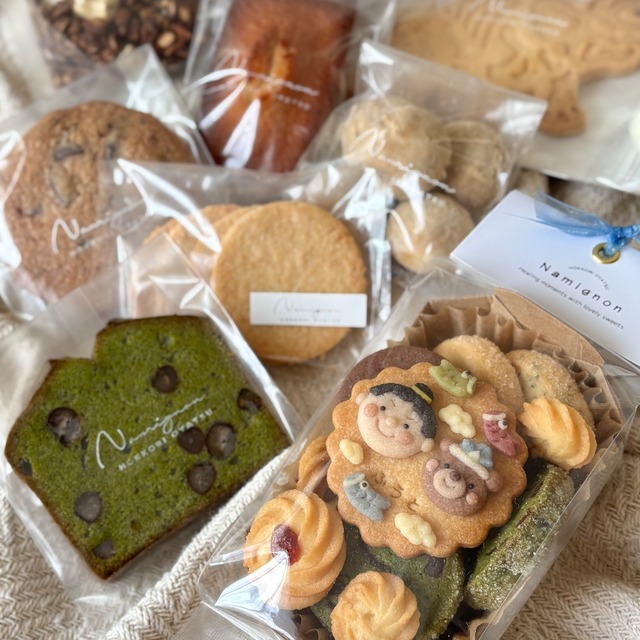 ■こちらのページは「ほっこりおやつセット」です。 「こどもの日クッキー2個セット」もございます^ ^ 【 4月30日発送 】 子どもが喜ぶ可愛らしいクッキーと、ナミニョンの レギュラーメンバー(焼き菓子)が詰め込まれたおやつ便\( ˆoˆ )/ お子さまのお名前を入れたクッキーは、心温まる特別な贈り物になります♡ おやつの写真はイメージです。種類はランダムで、何が届くかはお楽しみ♬ そして今回は、初のオンラインおやつ便を記念して 「グラノーラショコラ」又は「恐竜の化石クッキー」をプレゼント\( ˆoˆ )/ 「グラノーラショコラ」 主な材料は、ココナッツオイル、ナッツ、ココア、メープルシロップ。身体に嬉しい素材をチョイス! そして甘さ控えめ、グルテンフリーで毎日食べたいおやつです♡ 「恐竜の化石クッキー」 子どもに大人気!どんな恐竜が届くかはお楽しみ♬ 付属のチョコレートペンを溶かして、クッキーの溝に流し込めば出来上がり♡ ■セット内容 ・こどもの日クッキーアソート ・ナミニョンのおやつ5種類 ・グラノーラ 又は 恐竜クッキー ■名入れクッキーについて ・お名前はオプションにてご入力ください。 ・名入れ無し場合は「こどものひ」とご入力ください。 ・着色はすべて天然着色料を使用しています。 ( 苺 /バタフライピー/抹茶/かぼちゃ /ココア) ・手作りの為、デザインに個体差がございます。 ■賞味期限 発送から約2週間 ■発送・注文に関する情報や注意事項 ・4月30日発送 ・出来るだけ厳重な梱包で発送いたしますが、万が一破損されていた場合は補償が出来かねますので、ご了承くださいませm(_ _)m ■アレルギー情報 ◻︎小麦 ◻︎卵 ◻︎乳 ◻︎アーモンド ◻︎大豆 何かご不明な点があれば、ショップのお問い合わせからお気軽にご連絡ください^ ^